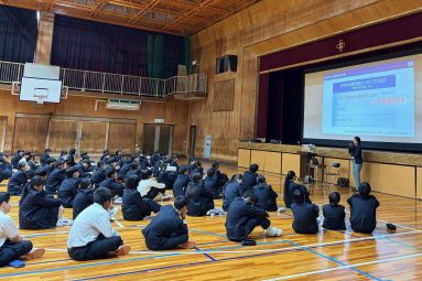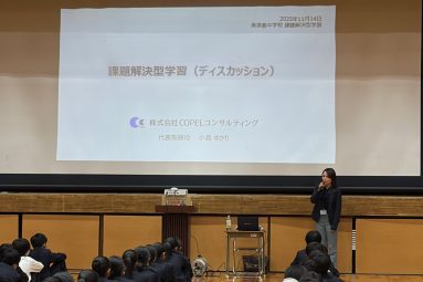 当社は大阪市立美津島中学校(淀川区)で2年生約150名を対象に、「課題解決学習」の授業を担当しました。内容は、アイデアの創出に向けたワークショップやプレゼンテーションを習得する授業です。
